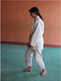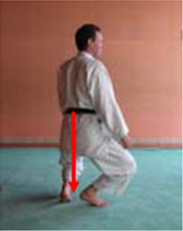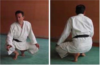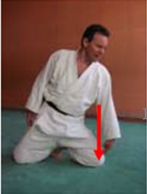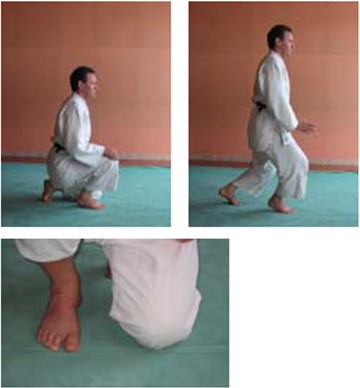 • In het algemeen gezien het grote aantal keren buigingen en strekkingen die inherent zijn aan Ukemi en Seiza : vermijd herhaalde schokken op de knie evenals het steunen met het volle gewicht op een enkele knie (zie figuur 5). Om zich op te richten na Ukemi volstaat het om de 2 voeten samen te brengen onder de heupen (billen) en de rechtstand steunend op één been te vermijden. De druk wordt dus op 2 benen uitgeoefend met als gevolg dat alle kracht verspreid wordt over de billen, hamstrings en bovenbeenstrekkers (zie figuur 6).