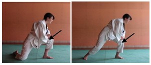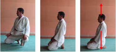 • Seiza : zich oprichten (Tachikata). De heupen komen omhoog, de tenen zoeken steun, de rechtervoet komt ter hoogte van de linkerknie.